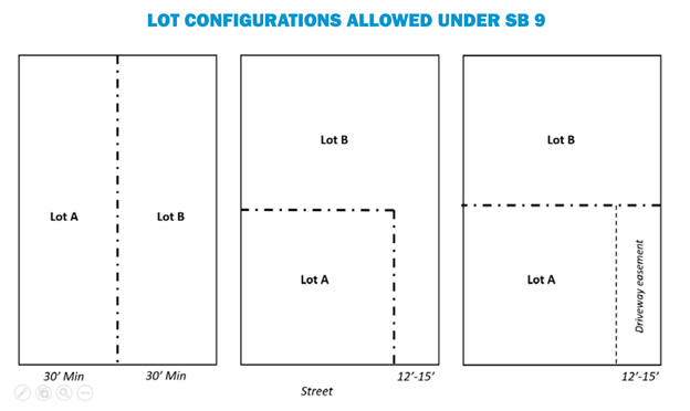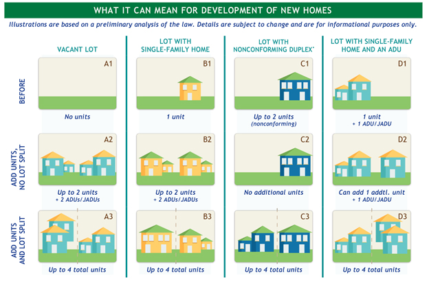 Senate Bill 9 (SB 9) enables creation of a duplex on a single-family lot and/or subdivision of the lot to construct either a single-family or duplex home on each subdivision. In addition, some cities have allowed ADUs to be constructed on a property that contains a duplex. All cities in California must implement SB 9.