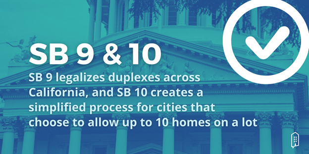 Senate Bill 10 (SB 10) enables cities to up-zone areas close to job centers, transit, and existing urbanized areas to allow up to 10 units on a property — subject to setbacks, easements, and other development standards as permitted by the new law — without having to go through the California Environmental Quality Act review process. SB 10 is optional and not all cities have agreed to implement this.